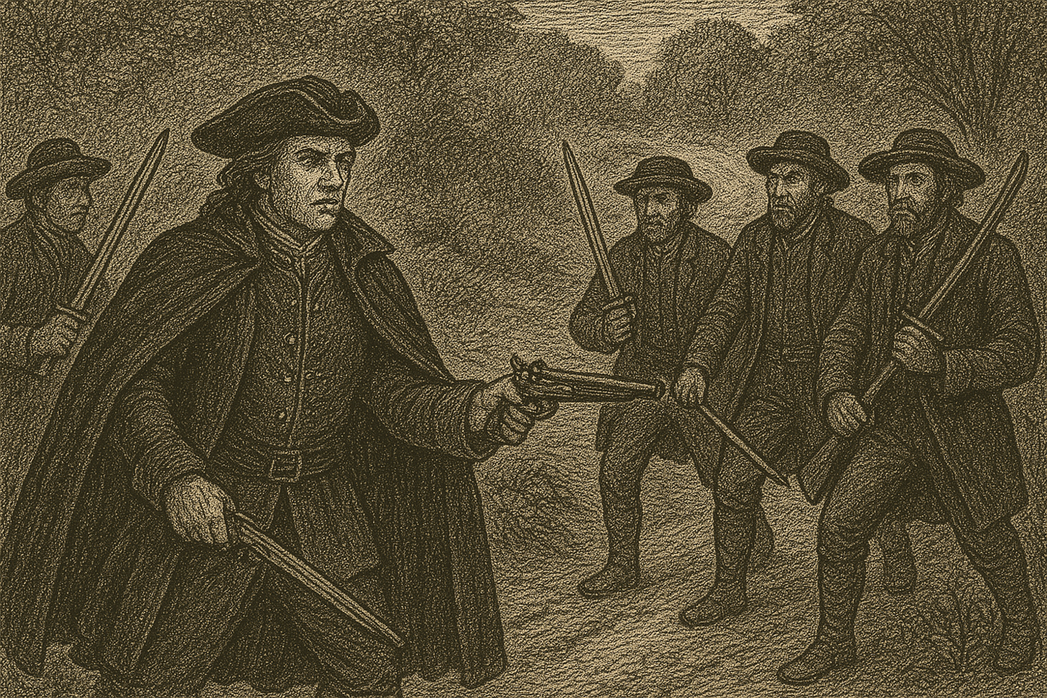 Из-за кустов с другой стороны дороги вывалились остальные разбойники. У кого дубина, у кого нож, у кого мушкет, весь ржавчиной покрытый.
